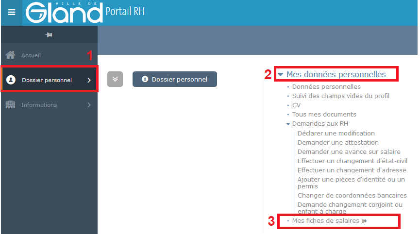 1. Pour se faire, rendez-vous dans le portail RH  à l’adresse https://portailrh.gland.ch/index.php ensuite, aller dans le menu de gauche dans  « Dossier personnel (1) »,  dans « Mes données personnelles (2) » et finalement cliquer sur « Mes fiches de salaires (3) ».