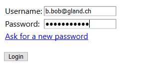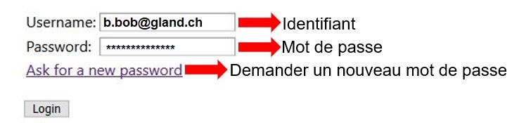 2. Une nouvelle fenêtre s’ouvre, dans celle-ci il vous est nécessaire d’introduire votre identifiant (username)  en utilsant votre email @gland.ch et mot de passe (password) reçu précédemment par email.