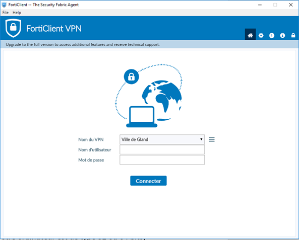 • Une fois le client VPN configuré et démarré, saisir les paramètres d’identification personnels qui vous auront été communiqués par le Service des finances et cliquer sur « Connecter »:
