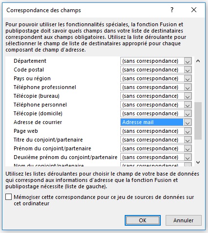 • Dans la fenêtre qui s’est affichée, affecter le nom du champ d’adresse courriel du fichier Excel (« Adresse mail » dans l’exemple) au champ « Adresse de courrier » :