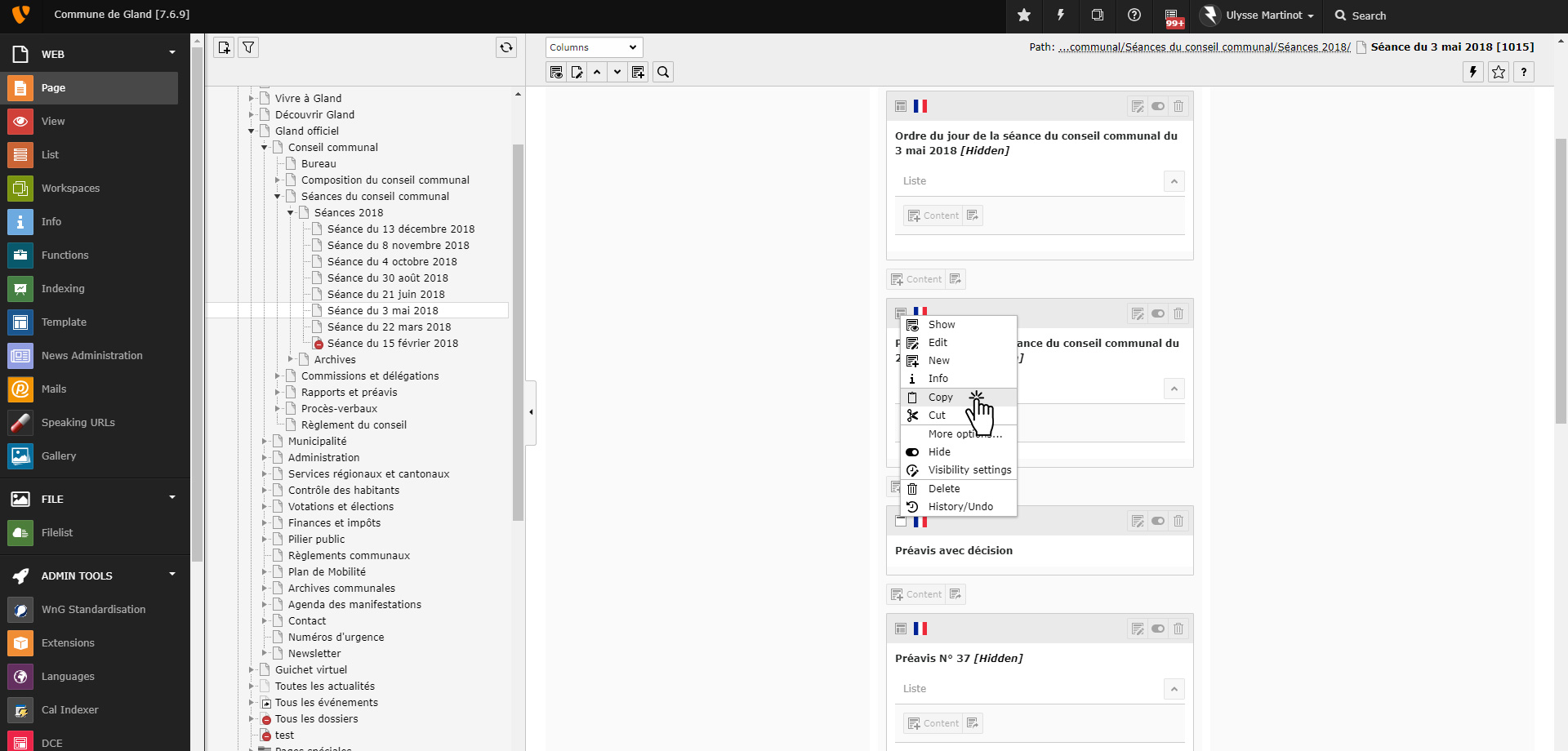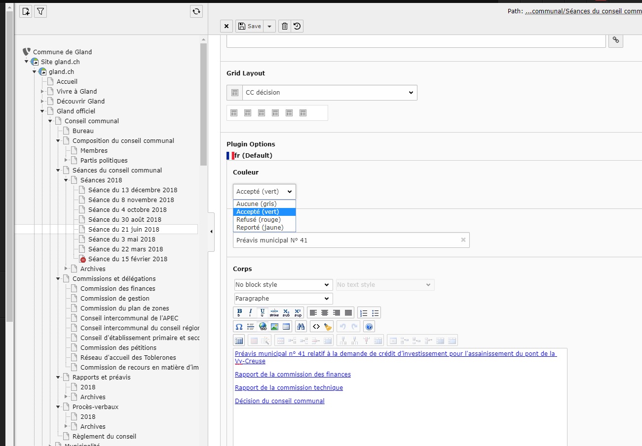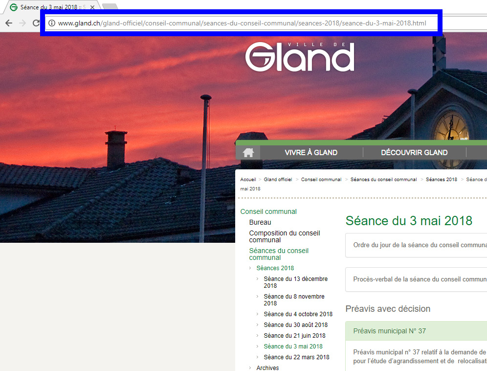 2. Sélectionner dans l’arborescence, la page de la séance du conseil communal (« Gland officiel » > « Conseil communal » > « Séances du conseil communal » > « Séance XXXX » > « Séance du XX xxxx XXXX »).