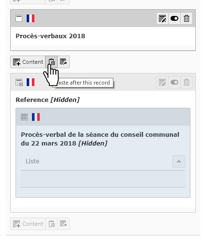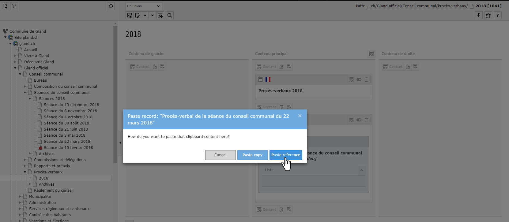 5. Créer des références (équivalent à un copier/coller, voir images ci-dessous) des derniers préavis sur la page dédié au PV (dans l’arborescence : « Gland officiel » > « Conseil communal » > « Procès-verbaux » > « XXXX »). Faire la même opération pour les préavis (dans l’arborescence : « Gland officiel » > « Conseil communal » > « Rapports et préavis » > « XXXX »).