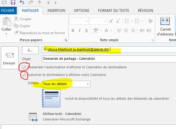 3. Une nouvelle fenêtre s’ouvre afin que vous puissiez envoyer la demande de partage par email. Remplissez les champs ci-dessous, je vous précise que si vous mettez « Tous les détails » vos collègues pourront voir la dénomination de vos rendez-vous, mais pas vous rendez-vous privés.
